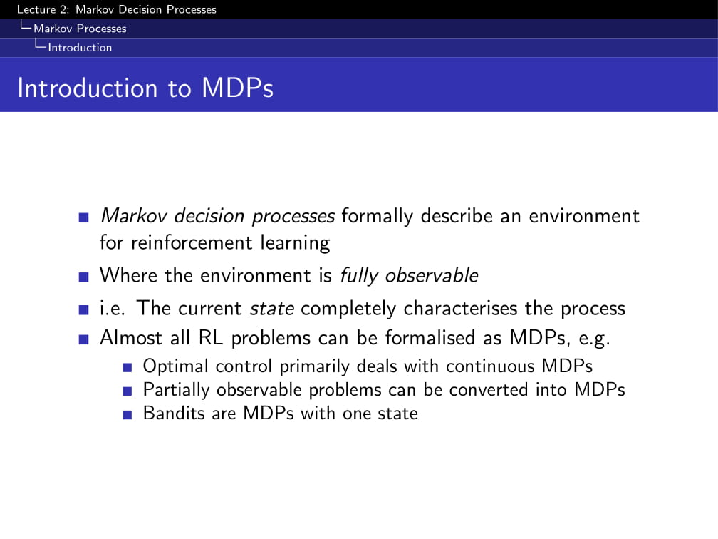 이번 강의에서는 위와 같은 순서로 진행되고 Extensions to MDPs는 Silver강의에서도 다루지 않았다.