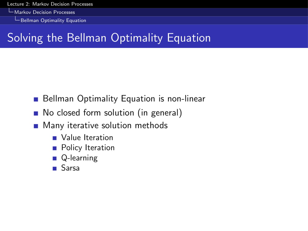 bellman optimality Equation은 non linear한 문제이기떄문에 closed form의 정답ㄷ이 없다.