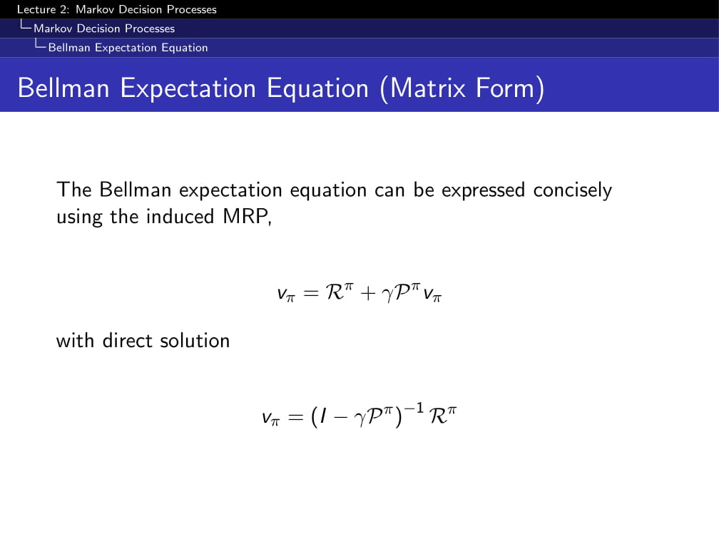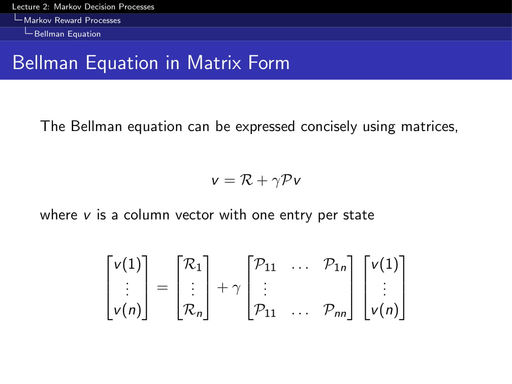 저 bellman Equation을 state transition matrix를 이용하여 한줄로 표현하면 위와 같다.