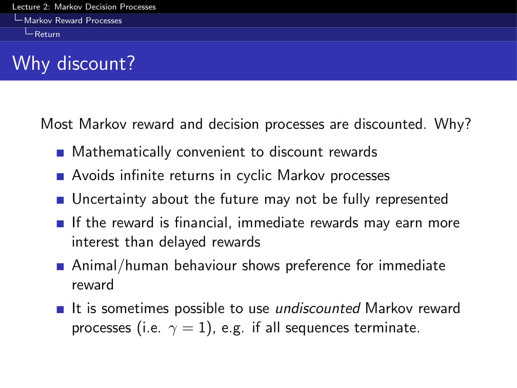discount을 통해 reward를 수렴하게 만들어 수학적으로 쉽게 다룰수있다.