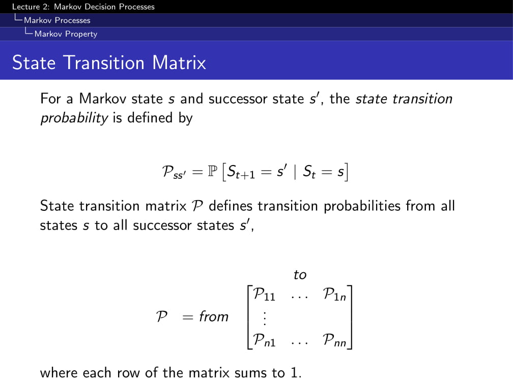 state transition Matrix는 t state에서 t+1시점의 각 state로 전이될 확률