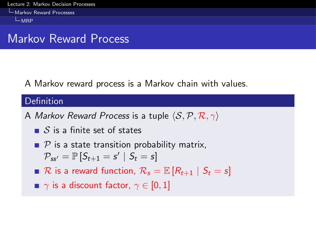 Markov Reward Process에서는 Markov process에서 Reward와 gamma가 추가됨